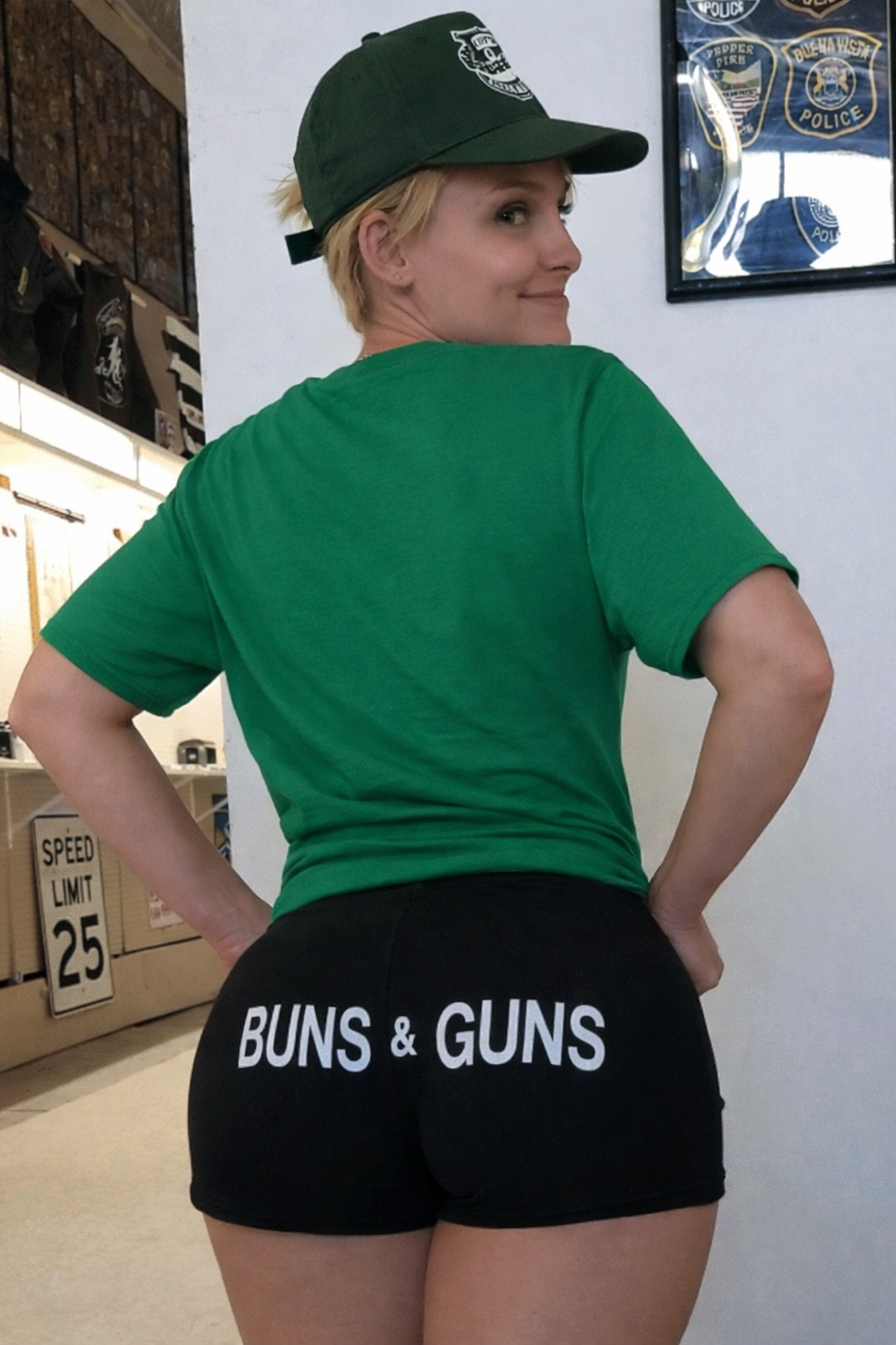 Have some laughs with these Cops & Doughnuts Cheer Shorts. They have our badge/doughnut logo on the left front and Buns & Guns on the back. Available in black only Screen printing is white. Classic cheerleader cut shorts with V-notch and elastic waistband.