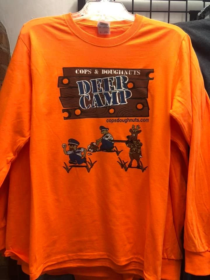 “Deer Camp” Cops & Doughnuts is screen printed on the front.